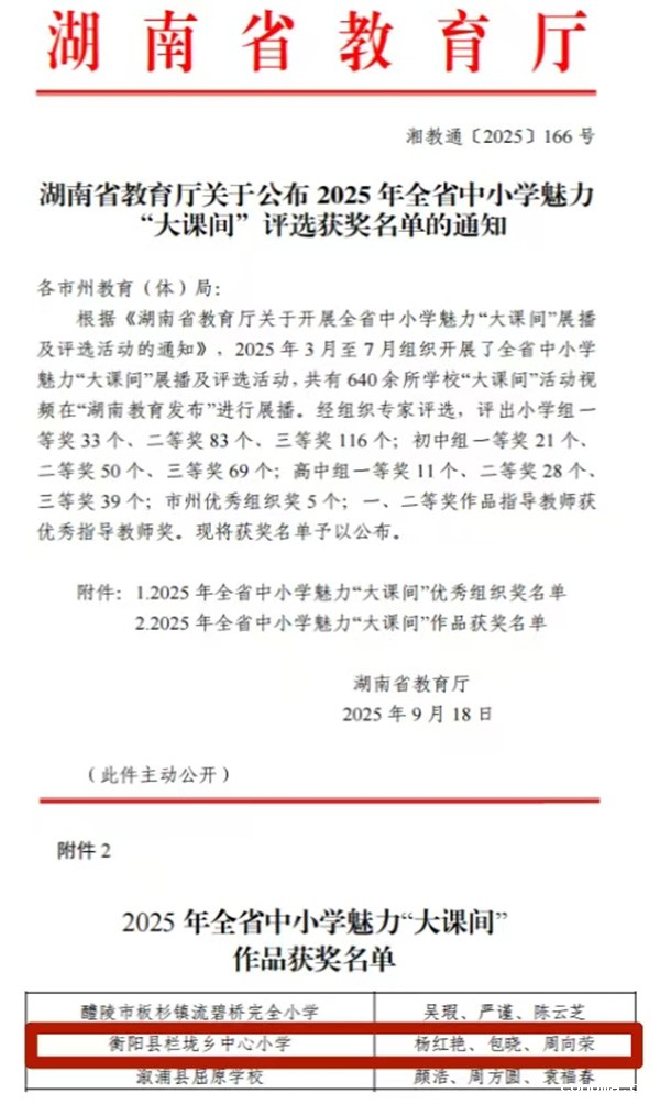 9月18日,湖南省教育厅公布了2025年全省中小学魅力“大课间”评选活动的获奖名单,栏垅乡中心小学凭借出色的大课间活动表现,荣获小学组二等奖。