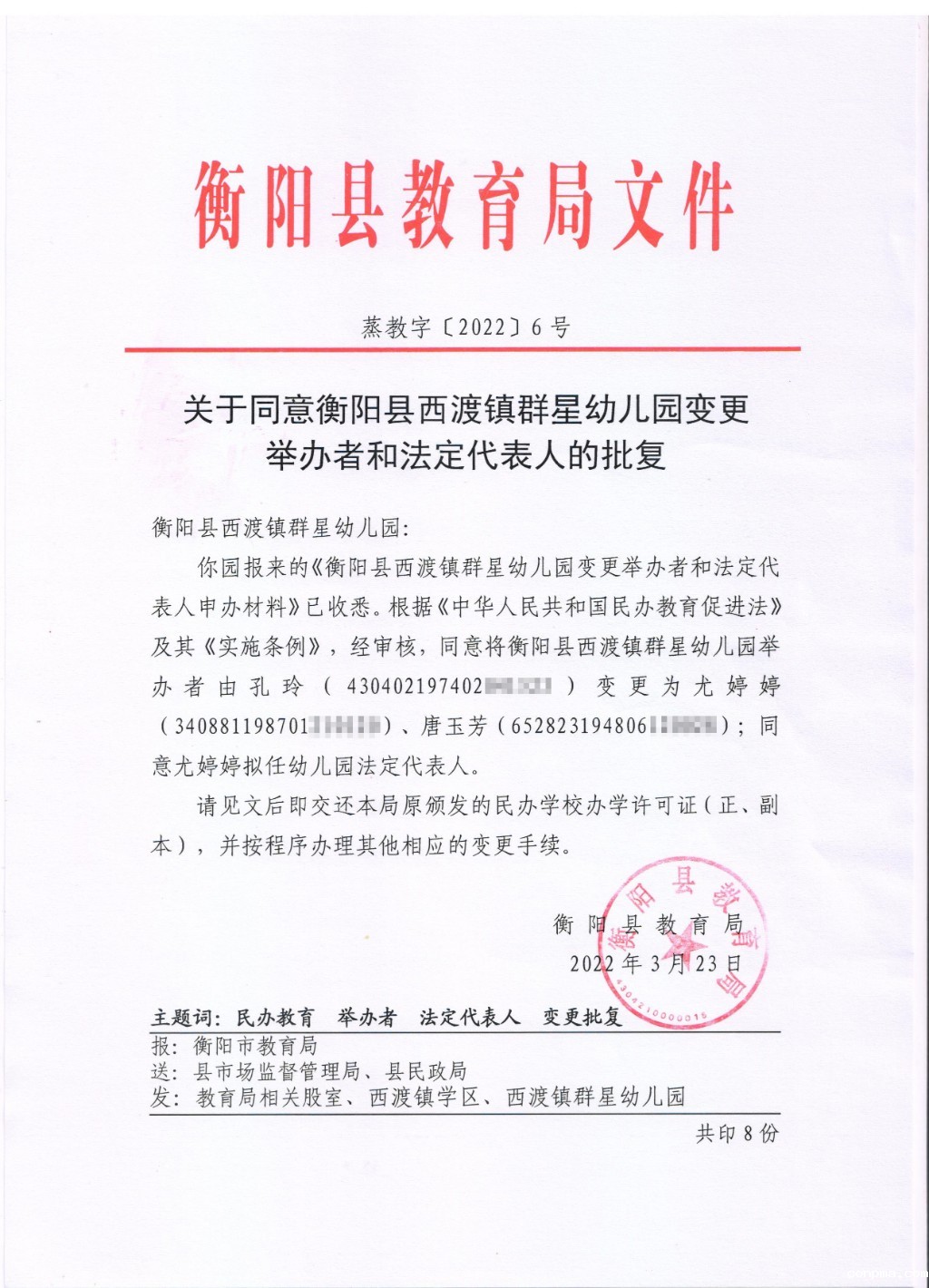 关于同意衡阳县西渡镇群星幼儿园变更举办者和法定代表人的批复