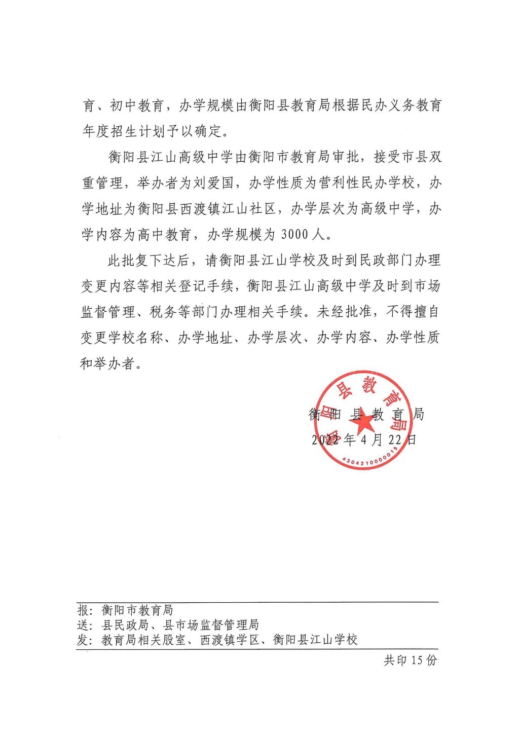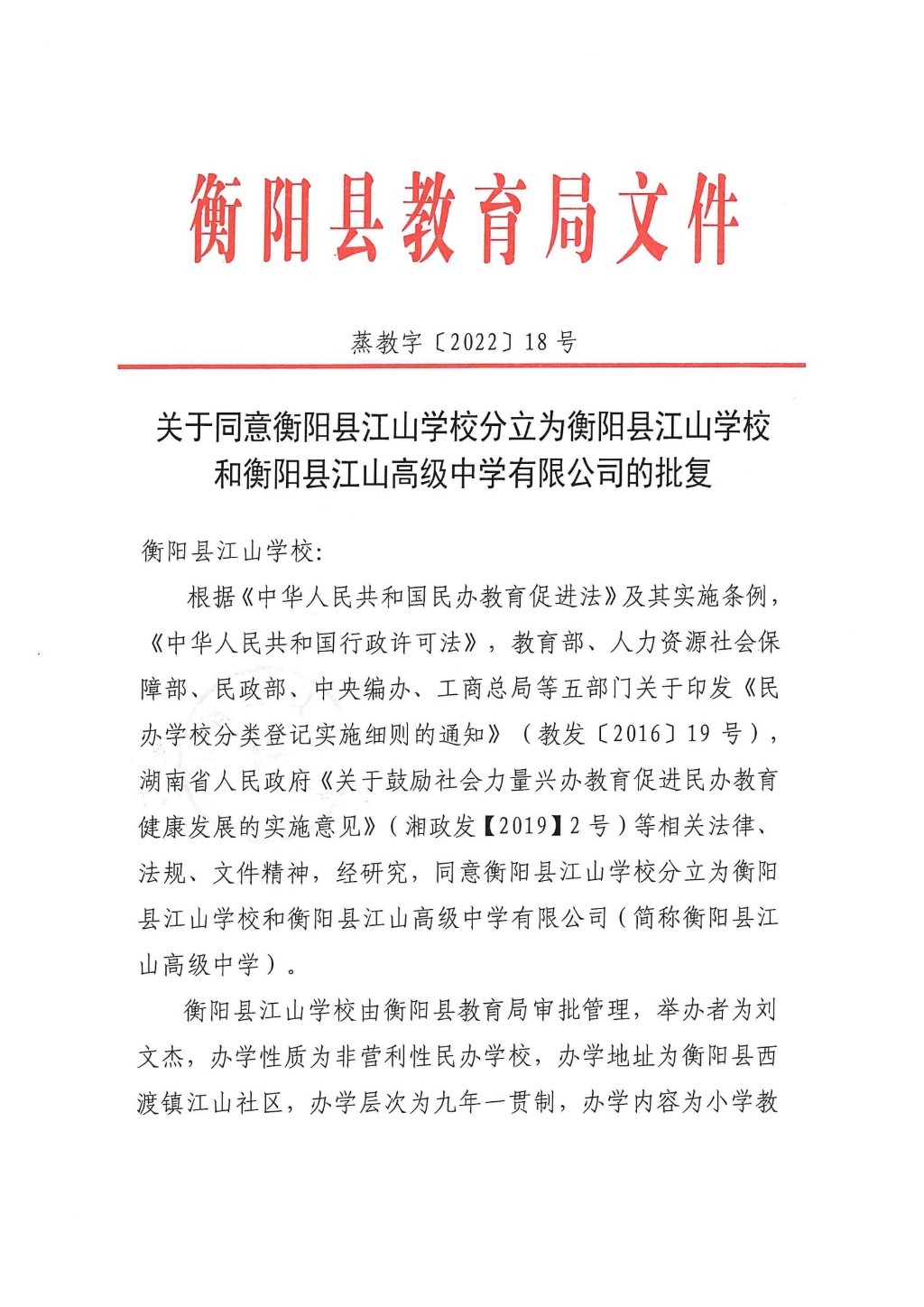 关于同意衡阳县江山学校分立为衡阳县江山学校和衡阳县江山高级中学有限公司的批复