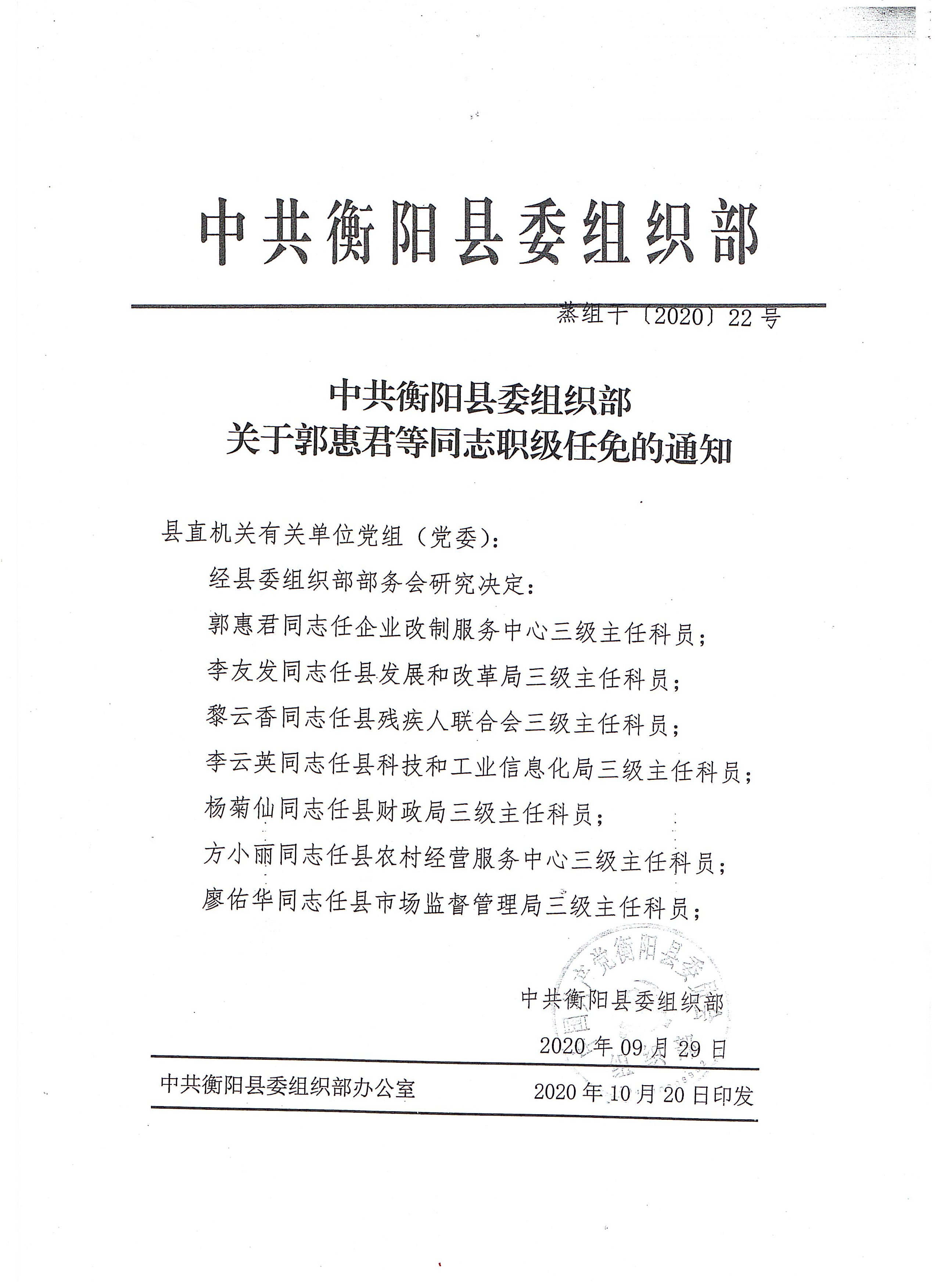 中共衡阳县委组织部关于郭惠君等同志职级任免的通知
