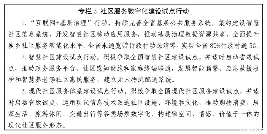 9.构筑美好数字服务新场景。统筹推进智慧社区基础设施建设,推动社区服务和管理功能综合集成,完善线上线下相结合的智慧社区服务体系。推进数字社区服务圈、智慧家庭建设,加快提升社区和家庭互联网宽带接入能力,促进社区家庭联动智慧服务生活圈发展。培育推广数字化应用场景,支持利用互联网、物联网、区块链、大数据、云计算、人工智能等现代信息技术,开展议事协商、养老、家政、卫生、托育、消防、安防等社区治理服务。大力发展社区电子商务,探索推动无人物流配送进社区。以县(市、区)为单位,深入组织开展智慧社区、现代社区服务体系试点建设。加快推进国家智能社会治理实验社区治理领域特色基地建设。