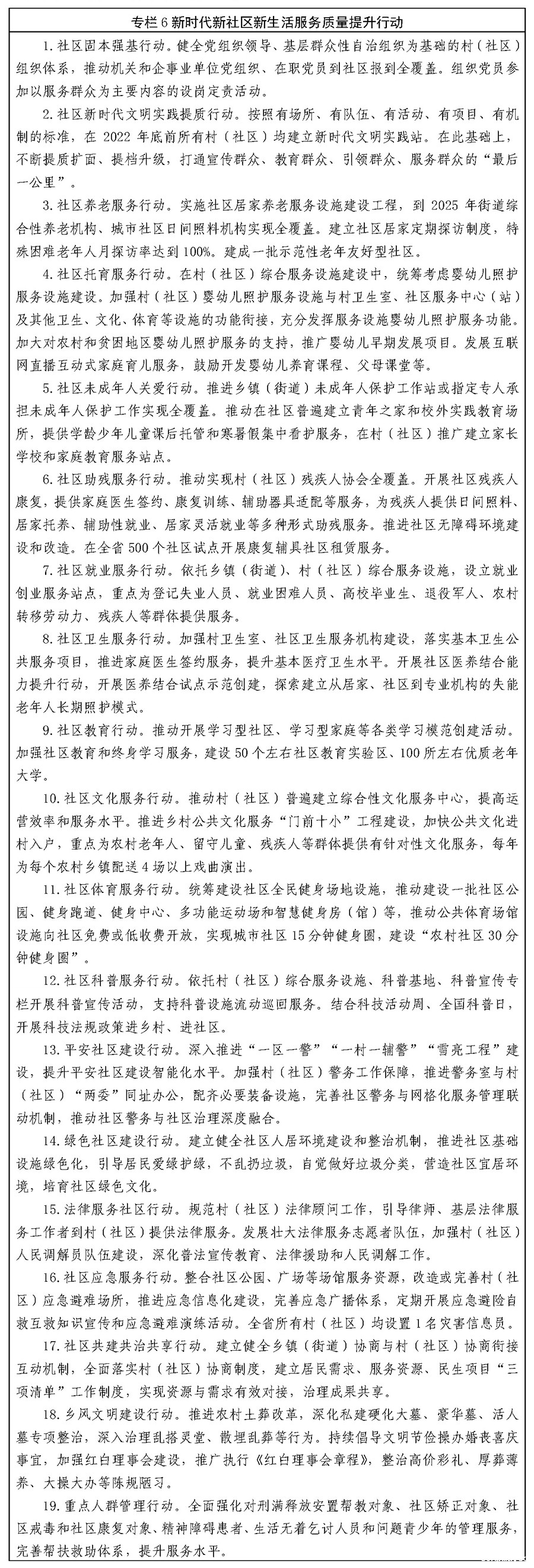 到2025年末,党建引领城乡社区服务体系建设更加完善,服务主体和服务业态更加丰富,服务手段更加智能,精准化、精细化水平持续提升,村(社区)为民、安民、便民功能充分发挥,人民群众操心事、烦心事、揪心事更好解决,获得感、幸福感、安全感不断增强。