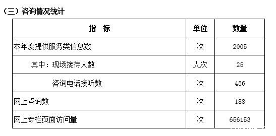 (四)积极推进服务公开。通过《湖南统计信息网》与全省网上政务服务和电子监察系统,推动政务服务事项办理由实体向网上办事大厅延伸,推进“互联网+政务服务”,百分之百办理落实了全省网上政务服务和电子监察系统内的所有待办事项。通过“执法程序(权力运行)”、“行政审批”等栏目,健全和实行首问负责、实时公开、全程监察等服务公开制度,全面公开统计工作相关流程、期限和结果,依据和标准,以及资料和监督方式等,实现统计服务全过程公开、全流程监察。修订《省统计局公共服务事项服务指南》,从事项名称、办理依据、牵头实施机构、共同实施单位、服务对象、服务类别、申请条件、申报材料、服务流程、办理时限、收费依据及标准、咨询方式十一个方面明确公共服务事项的具体办理流程。
