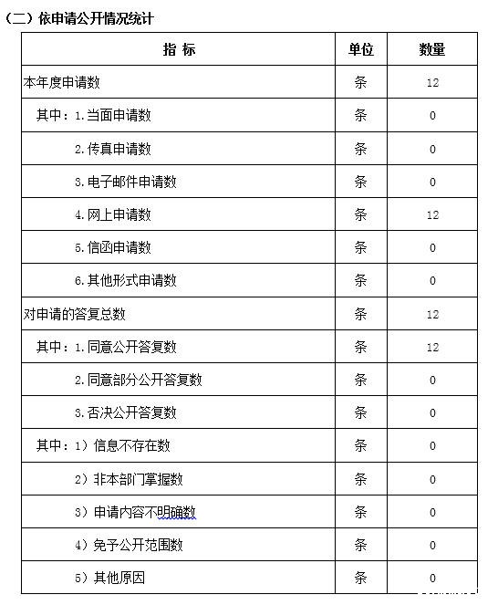 2017年,收到依申请公开网上申请数12件,已主动公开答复12件,同意公开答复12件。