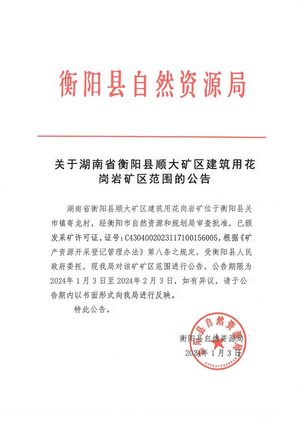 湖南省衡阳县顺大矿区建筑用花岗岩矿区范围的公告