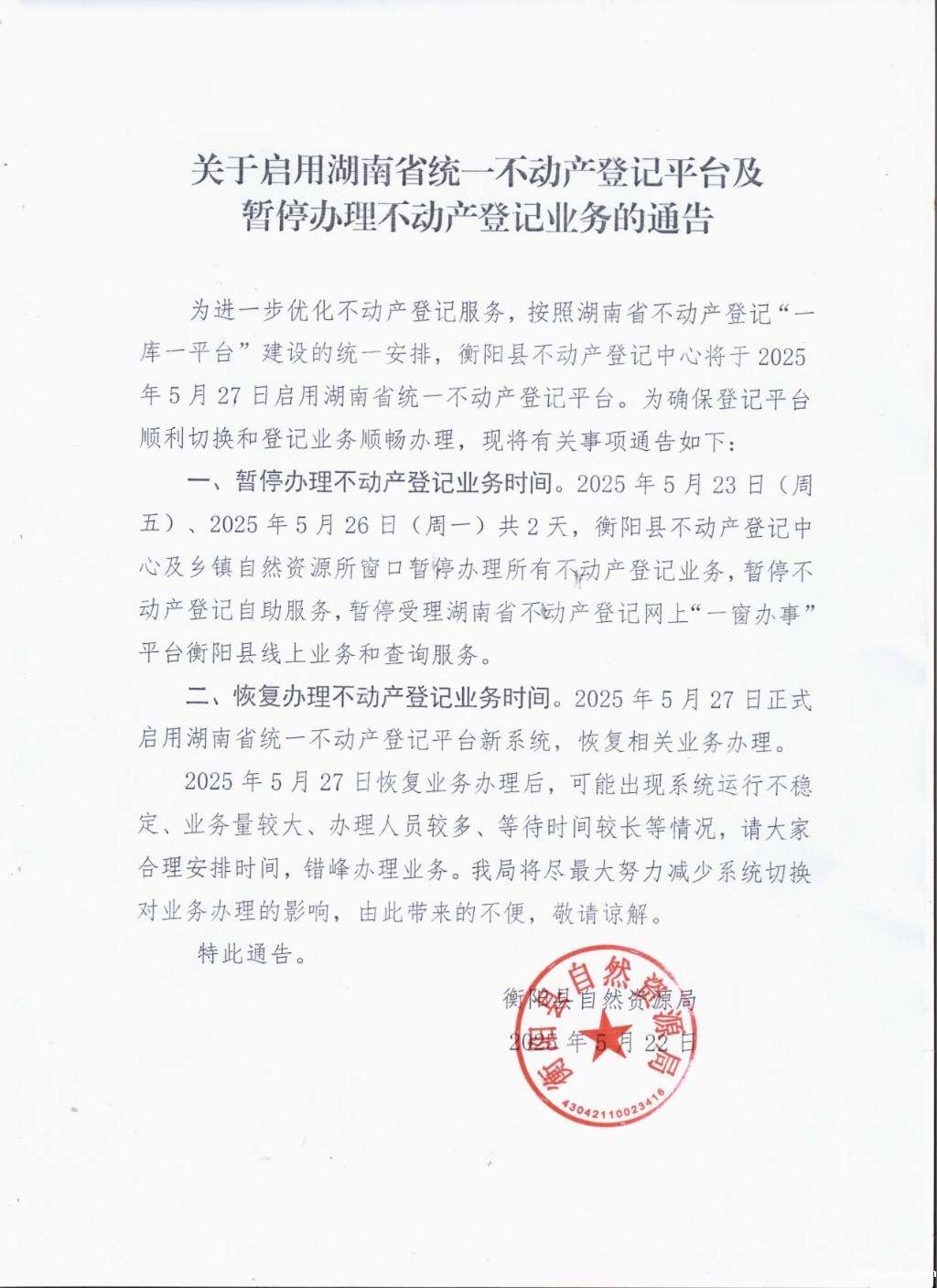 关于启用湖南省统一不动产登记平台及暂停办理不动产登记业务的通告