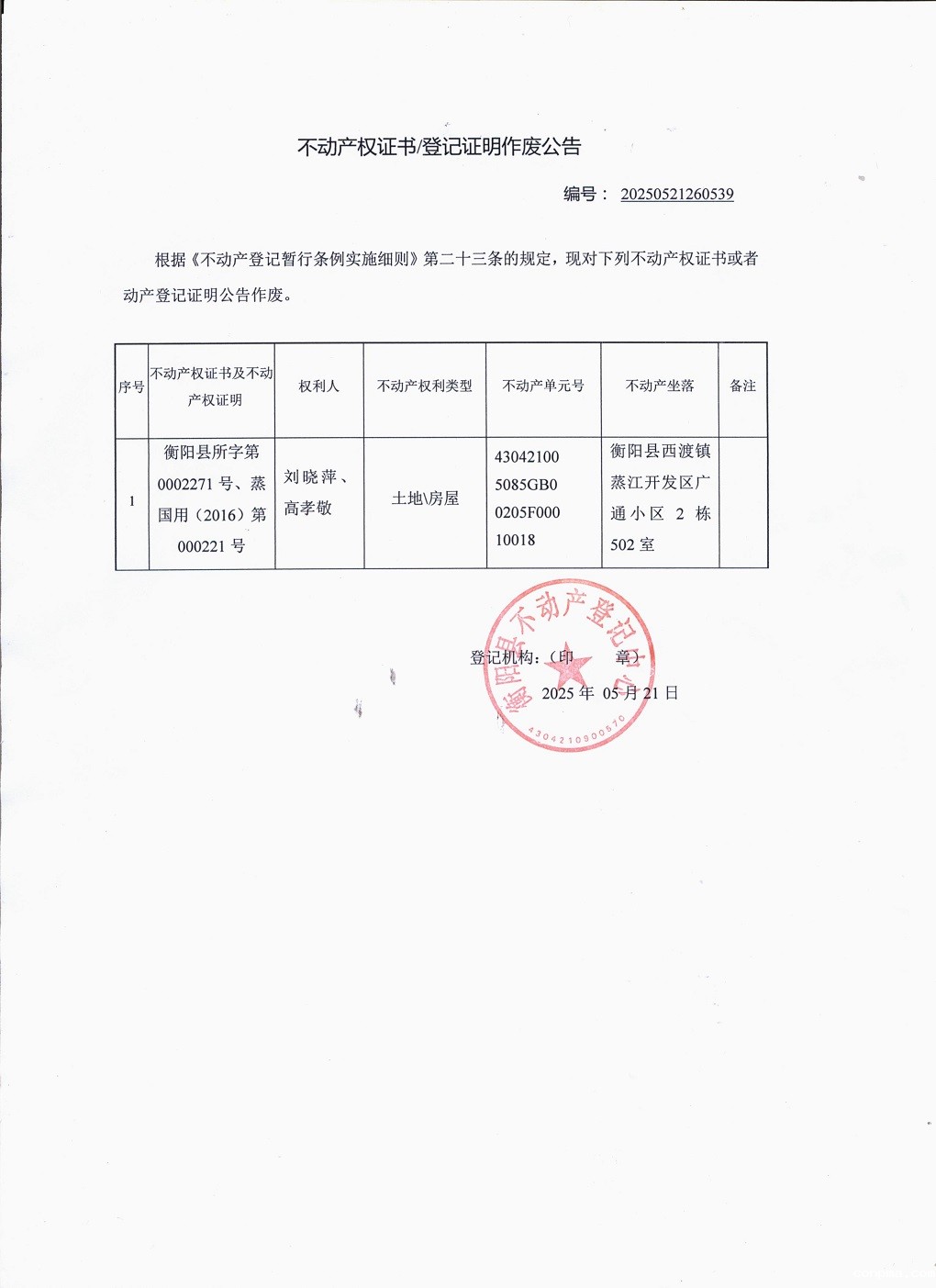 关于衡阳县所字第0002271号房产证和蒸国用(2016)第000221号国有土地使用权证作废公告