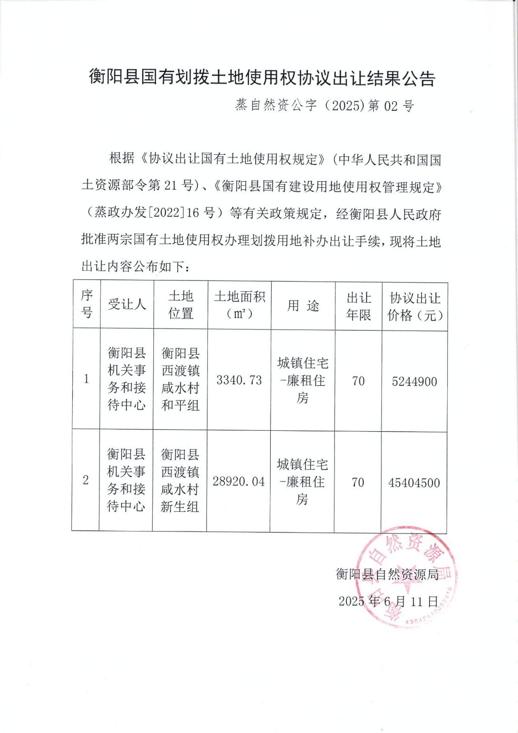 衡阳县国有划拨土地使用权协议出让结果公告 蒸自然资公字(2025)第02号