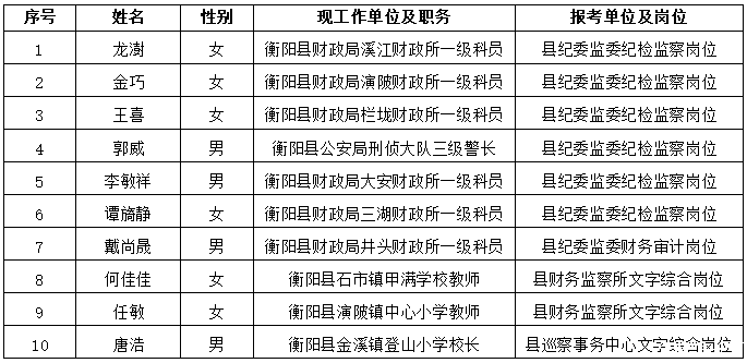 衡阳县纪委监委及巡察机构公开遴选(选调)拟录用对象名单