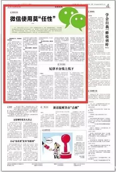 《中国纪检监察报》曾刊文《微信使用莫“任性”》,怒批少数干部“任性”使用微信的现象。文章称有人在“朋友圈”妄议中央大政方针,有人在微信群发放红包拉票贿选,更有甚者利用微信造谣、传谣……