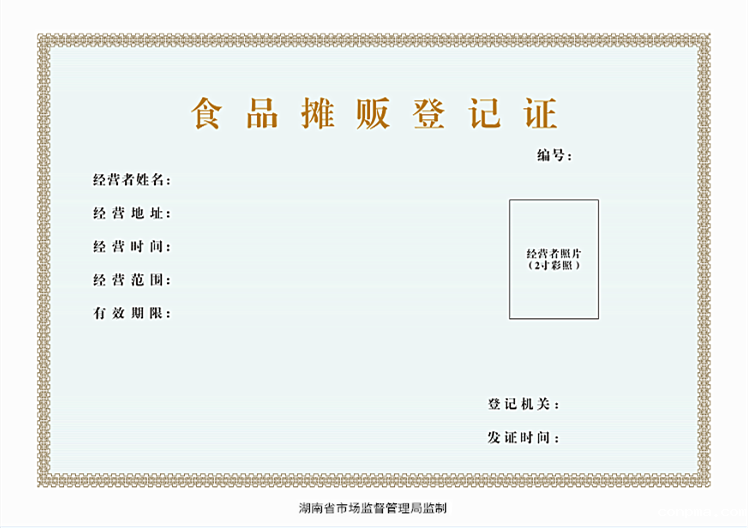 《食品摊贩登记证》统一为A4纸张规格大小。