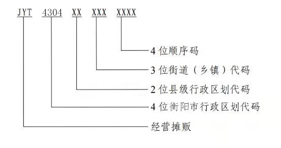 2.食品摊贩登记证编号规则:以JYT标识,后加13位阿拉伯数字构成。其中12位数字从左至右依次为:4位地市级行政区划代码、2位区县级行政区划代码、3位街道(乡镇)级代码、4位顺序码。每个食品摊贩登记证编号具有唯一性。具体表示形式如下图所示: