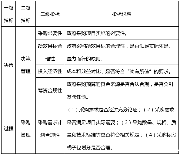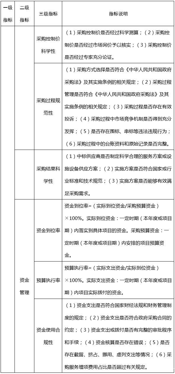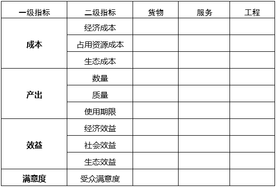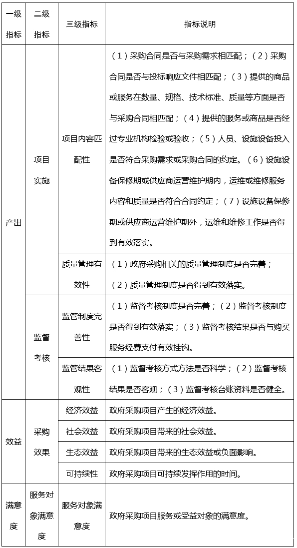 (六)建立健全重大政府采购事项重点绩效评价机制。建立健全重大政府采购事项绩效评价机制,强化评价结果应用、抓实问题整改,对于改进管理、优化预算安排、提高资金使用绩效和政策实施效果等发挥着重要作用。绩效评价是指根据设定的绩效目标,依据规范的程序,用定量分析和定性分析相结合的方式,对政府采购决策、采购管理、资金管理、项目实施、监督考核、产出、效果和满意度进行系统和客观的评价(参考表2)。绩效评价工作一般由第三方机构或部门内独立的监管机构、财政部门组织开展,绩效评价结果应作为改进管理和编制以后年度预算的依据。绩效评价方法主要包括成本效益分析法、比较法、因素分析法、最低成本法、公众评判法、标杆管理法等。根据评价对象的具体情况,可采用一种或多种方法。