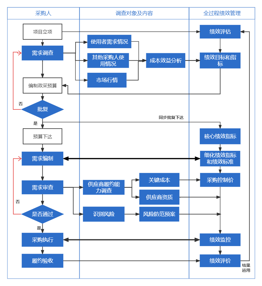 绩效评价结果应用是政府采购效果信息反馈给采购人、实施全过程闭环绩效管理的关键环节,采购项目考核和评价结果应作为付费、续约的依据,以及下一轮政府采购的参考。要建立政府采购项目绩效评价结果激励约束机制,对绩效好的政府采购项目,原则上预算优先保障;对绩效一般的要督促改进;对低效无效采购项目削减或取消,并按照相关法律法规追究采购人的责任。政府采购需求管理与全过程绩效管理有效衔接机制参考图1。