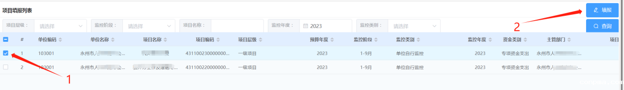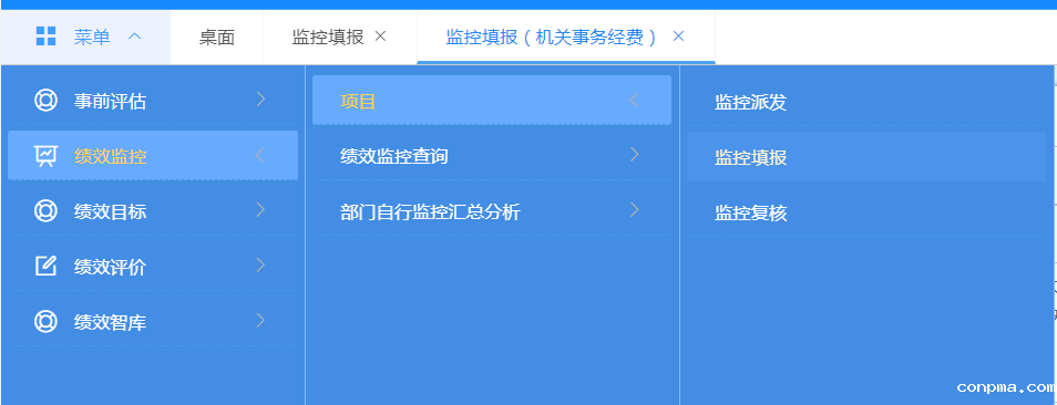 1.填报的菜单需使用经办岗登录,点击左上角菜单-绩效监控-项目-监控填报。