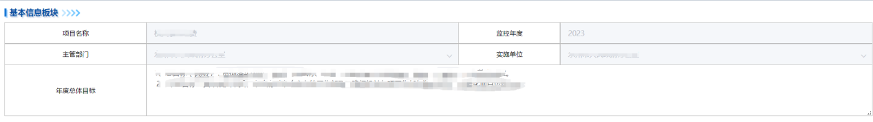 监控一共分为三个板块,基本信息板块、资金使用板块、指标情况板块。其中:基本信息板块会同步单位信息和年度总体目标,单位和项目信息默认不能修改,年度总体目标会取一体化中项目的年度总体目标,如果和实际情况不符,可以自行修改。