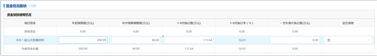 资金使用板块中的年初预算数会取项目的年初预算数,年中追加项目的年初预算数默认是0。调整数会取项目下发时的最新调整数,1-7月执行数会取国库集中支付项目支付数据。这三个数据如果和实际情况不符,可以双击金额进行修改(只能编辑本年一般公共预算拨款和其他资金栏,年度资金总额自动计算不能编辑),双击之后会出现文本框。执行率自动计算,不需要编辑。计算规则为1-7月执行数/调整后预算数,没有调整后预算数的项目则是1-7月执行数/年初预算数。全年预计执行数按实际情况填写,此项为必填项。是否预警自动判断,单位不能编辑。