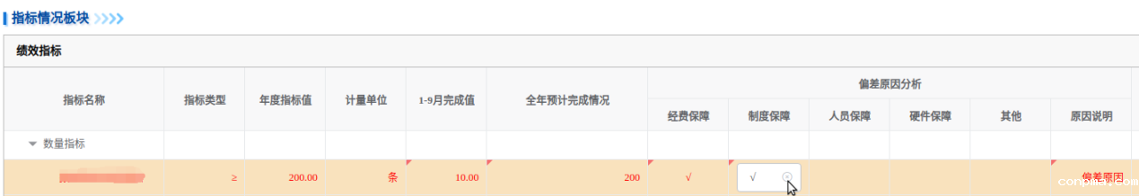 ②偏差原因分析:在系统产生预警时,需要填写偏差原因(即该项指标标红)。根据实际的情况在经费保障、制度保障、人员保障、硬件保障、其他几个类别中,点击勾选一个或多个类别,勾选错误可以将鼠标放置对应框的右边,会出现删除按钮。最后在原因说明列里说明具体原因。