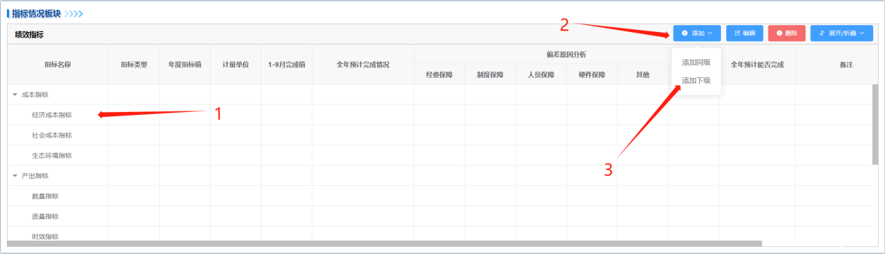 新增三级指标的方法为,选中对应的二级指标之后,点击右上的添加-添加下级就会生成一个三级指标。例:三级指标为经济成本下的一个指标,先选中经济成本指标再点击添加-添加下级,就会生成一个三级指标栏,然后再进行填写。
