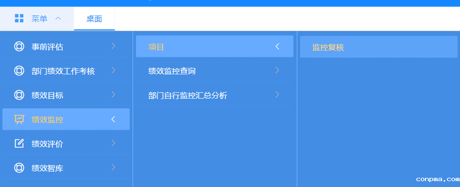 2.经办岗送审之后,需要使用审核岗进行审核。进入的菜单为:绩效监控-项目-监控复核。经办岗的审核菜单不能审核本单位送审的监控。