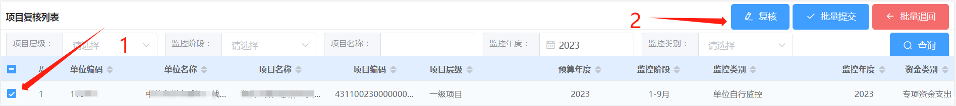 勾选项目点击右上角的复核,可以查看具体填报的内容,自行监控可以在审核的时候修改是否预警列。如果通过可以点击右下角的"保存并送审",不通过可以点击"退回"。审核岗审核通过之后会送审到财政局绩效股。在监控复核页面也可以勾选多个项目点击"批量提交"或批量退回,点击之后会直接审核,不会进入到填报详情页。