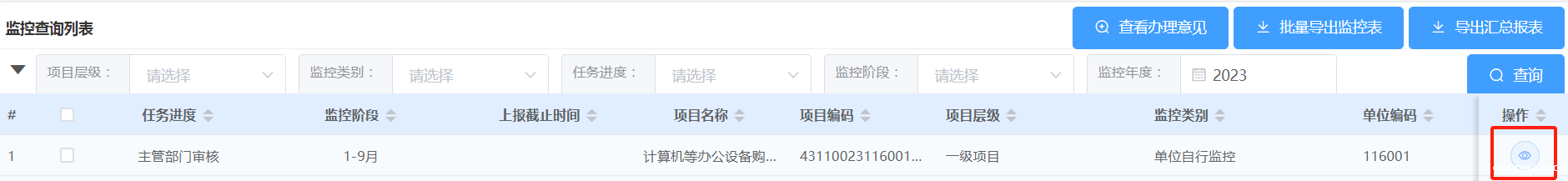 3.经办岗填写完成之后或审核岗审核完成之后如果需要再查看填写的监控内容,可以从菜单-绩效监控-绩效监控查询-绩效监控查询(项目),点击要查看项目的最后一列的眼睛图标。