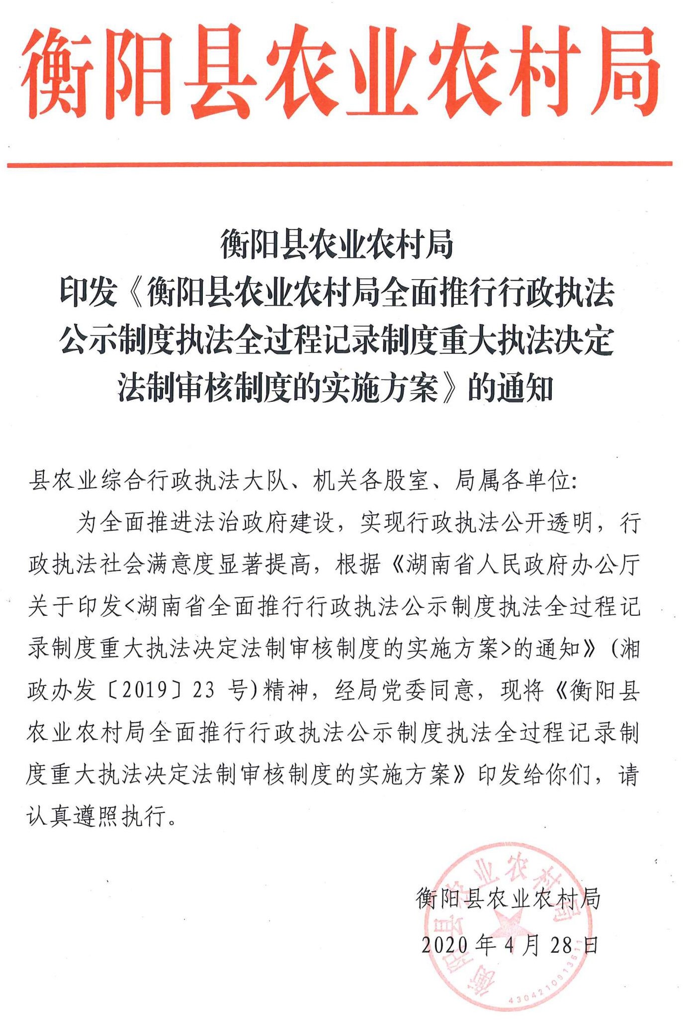 为贯彻落实《国务院办公厅关于全面推行行政执法公示制度执法全过程记录制度重大执法决定法制审核制度的指导意见》(国办发[2018118号)、《湖南省人民政府办公厅关于印发<湖南省全面推行行政执法公示制度执法全过程记录制度重大执法决定法制审核制度的实施方案>的通知》(湘政办发〔2019〕23号)文件精神,结合县农业农村局工作实际,制定本实施方案。