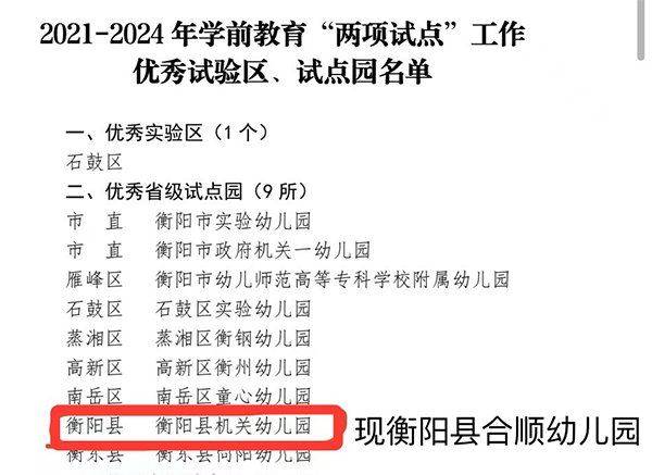 为了深入推进学前教育游戏活动和幼小科学衔接“两项试点”工作,规范各级各类幼儿园办园行为,衡阳县合顺幼儿园在2021 - 2024 年学前教育“两项试点”评选工作中表现突出,获评优秀省级试点园。